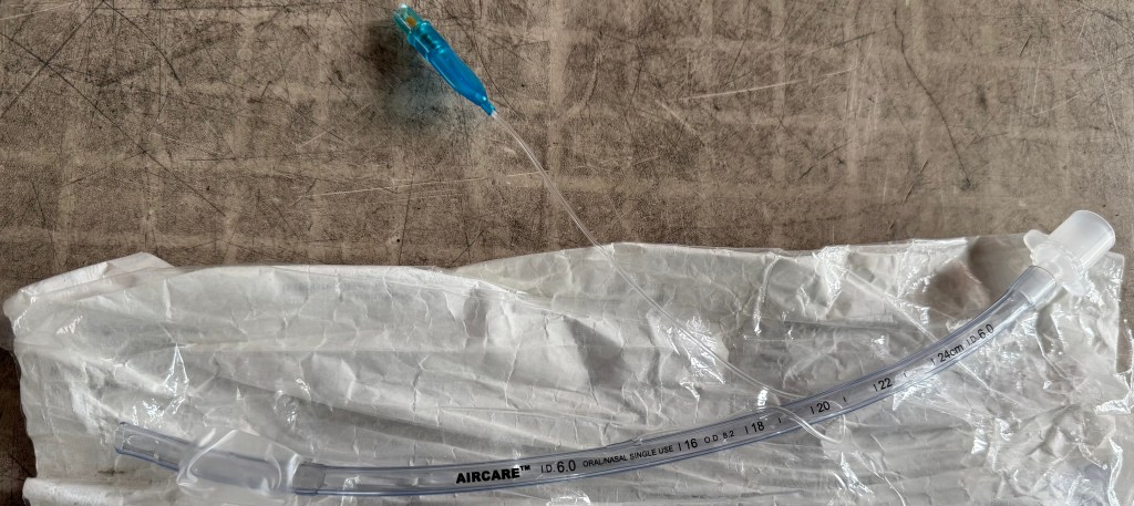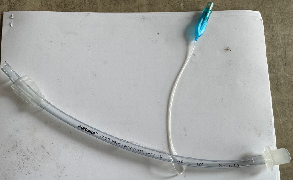 Endotracheal tube: A plastic tube inserted into the trachea through the vocal chords to secure a patent airway in a patient unable to protect their own airway, or is otherwise in need of ventilatory support.