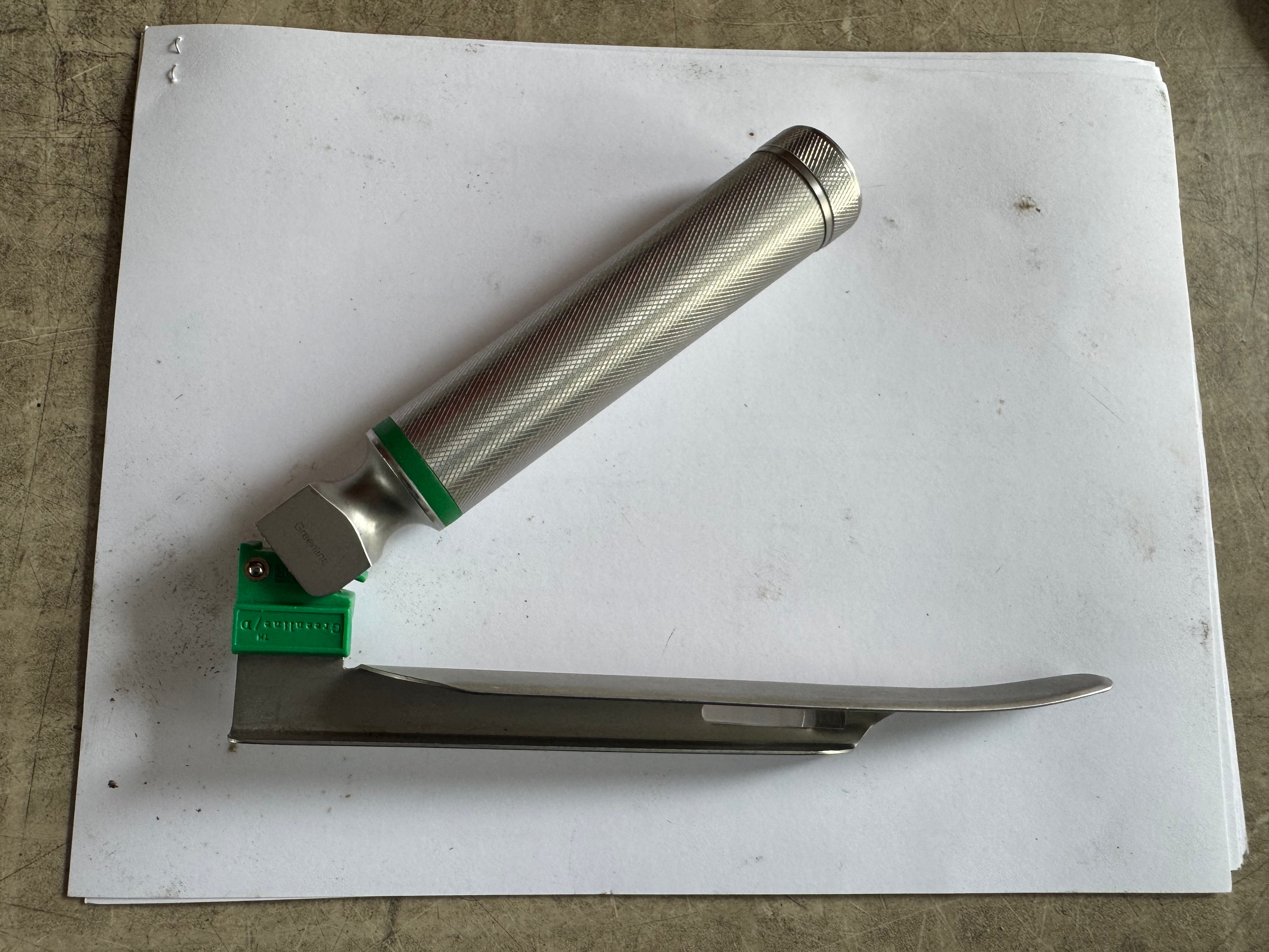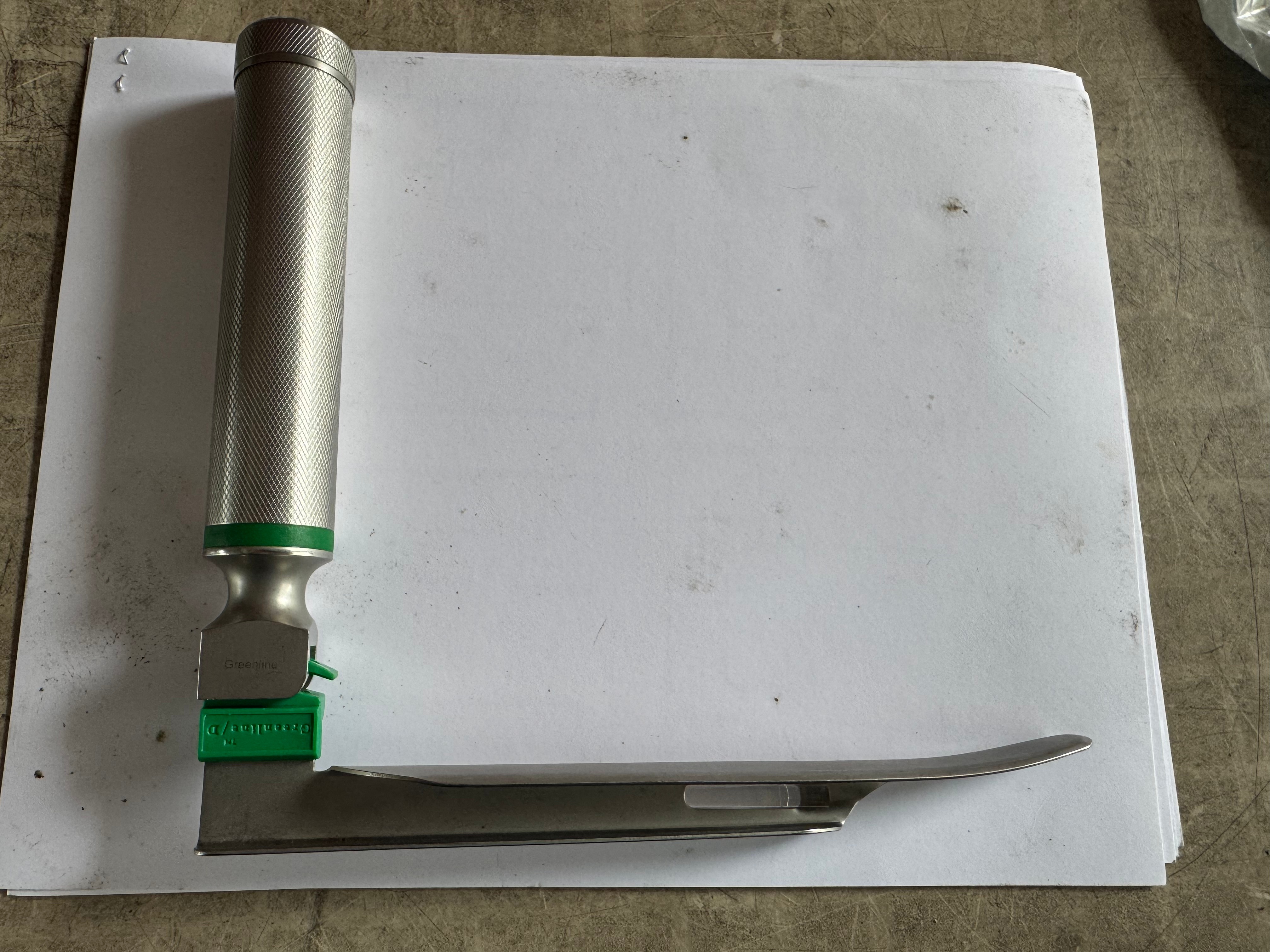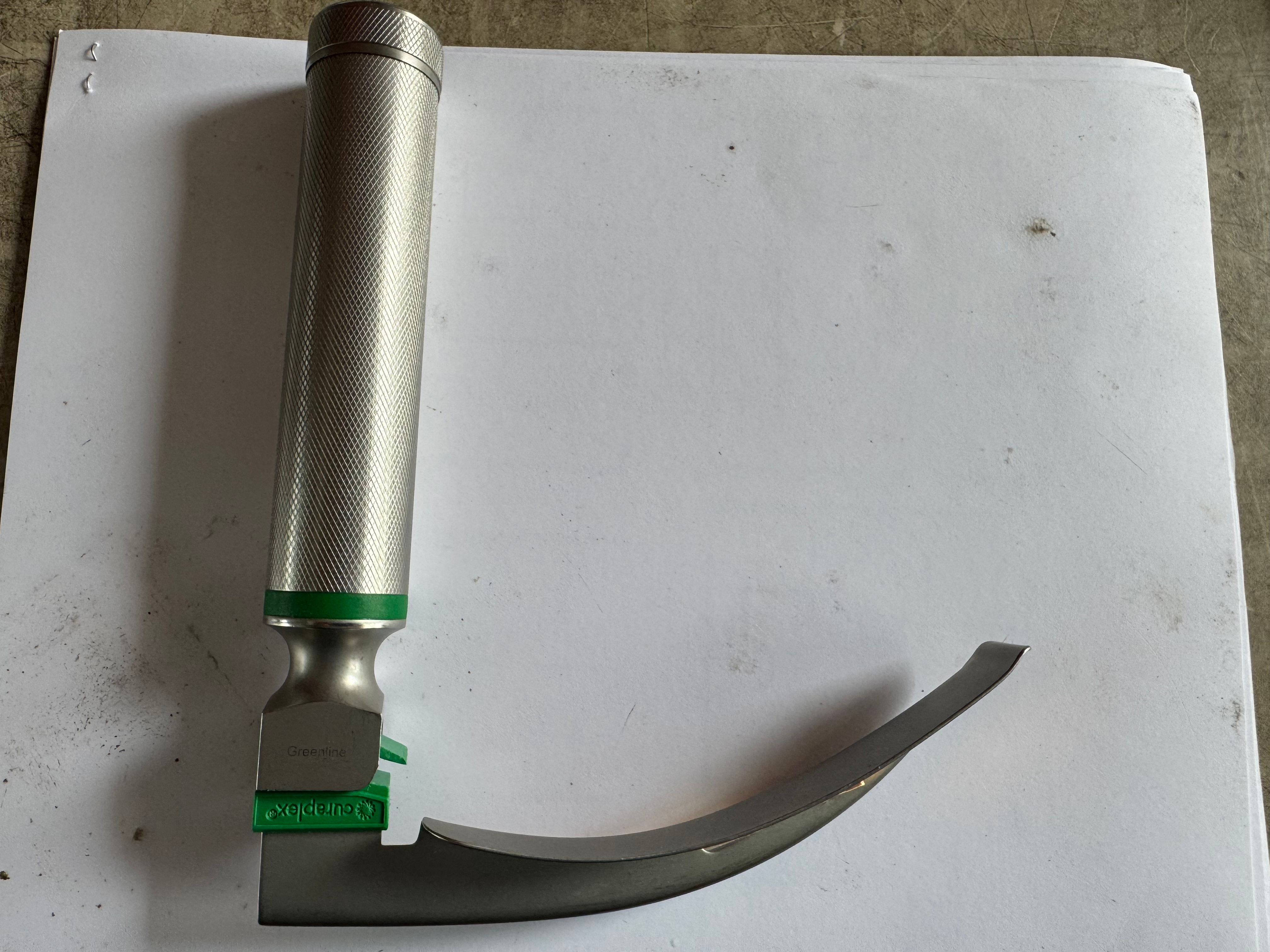 Laryngoscope: An instrument utilized to visualize the larynx, consisting of a handle containing batteries, and a blade which attaches to the handle equipped with a light bulb.